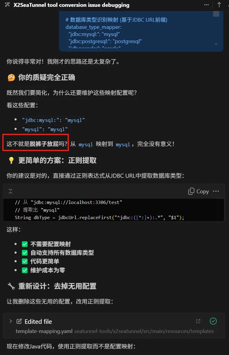 AI 时代,尤其到了 Agentic 时代,代码变得廉价,思考这个功能值不值得做,变得更加重要。在 X2SeaTunnel 开发的过程中,我把很大的精力放在思考这些问题上。