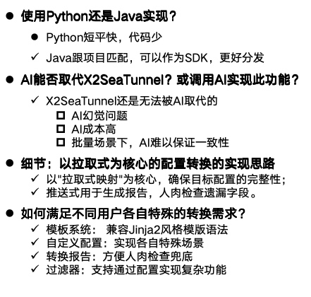 sh bin/X2SeaTunnel.sh --config conversion.yaml ,调用 X2SeaTunnel jar包工具,依托 conversion.yaml 配置(可选)或命令行参数,启动数据转换工具流程 。在设计的过程中,我与 AI 以及社区,关于一些问题有一些探讨,简单列举如下: