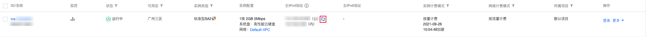在“实例管理”页面,选择需转换实例的地域,单击对应实例的普通公网 IP 右侧的转换按钮,如下图: