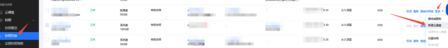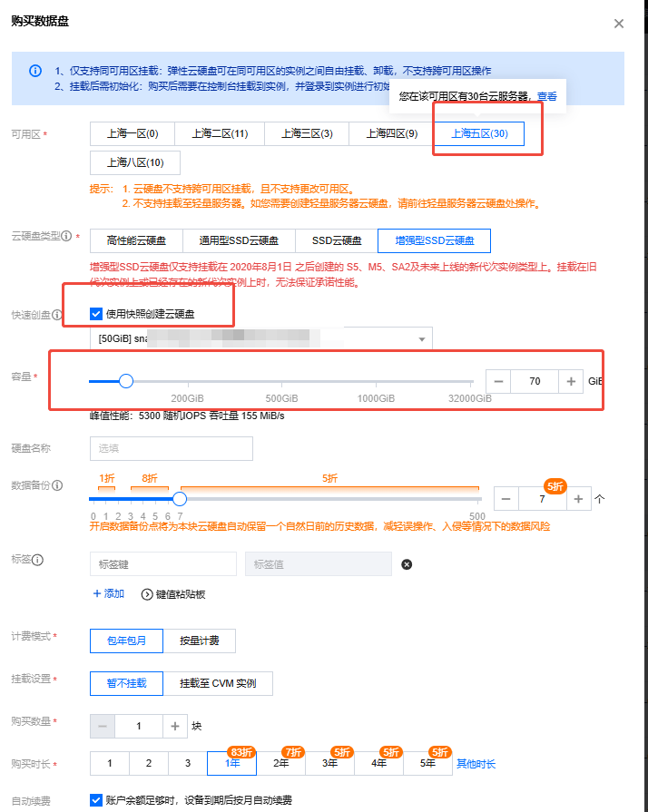 注意:目标可用区和容量不能小于原云盘,如下图