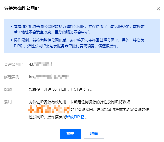 在弹出的“转换为弹性公网IP”窗口中,单击确定即可。