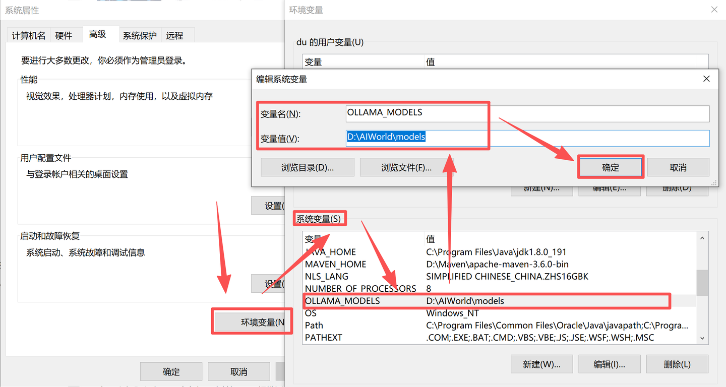 9.安装的路径配置完毕,还需新建或者修改系统变量中的OLLAMA_MODELS变量,将变量值改为目标路径