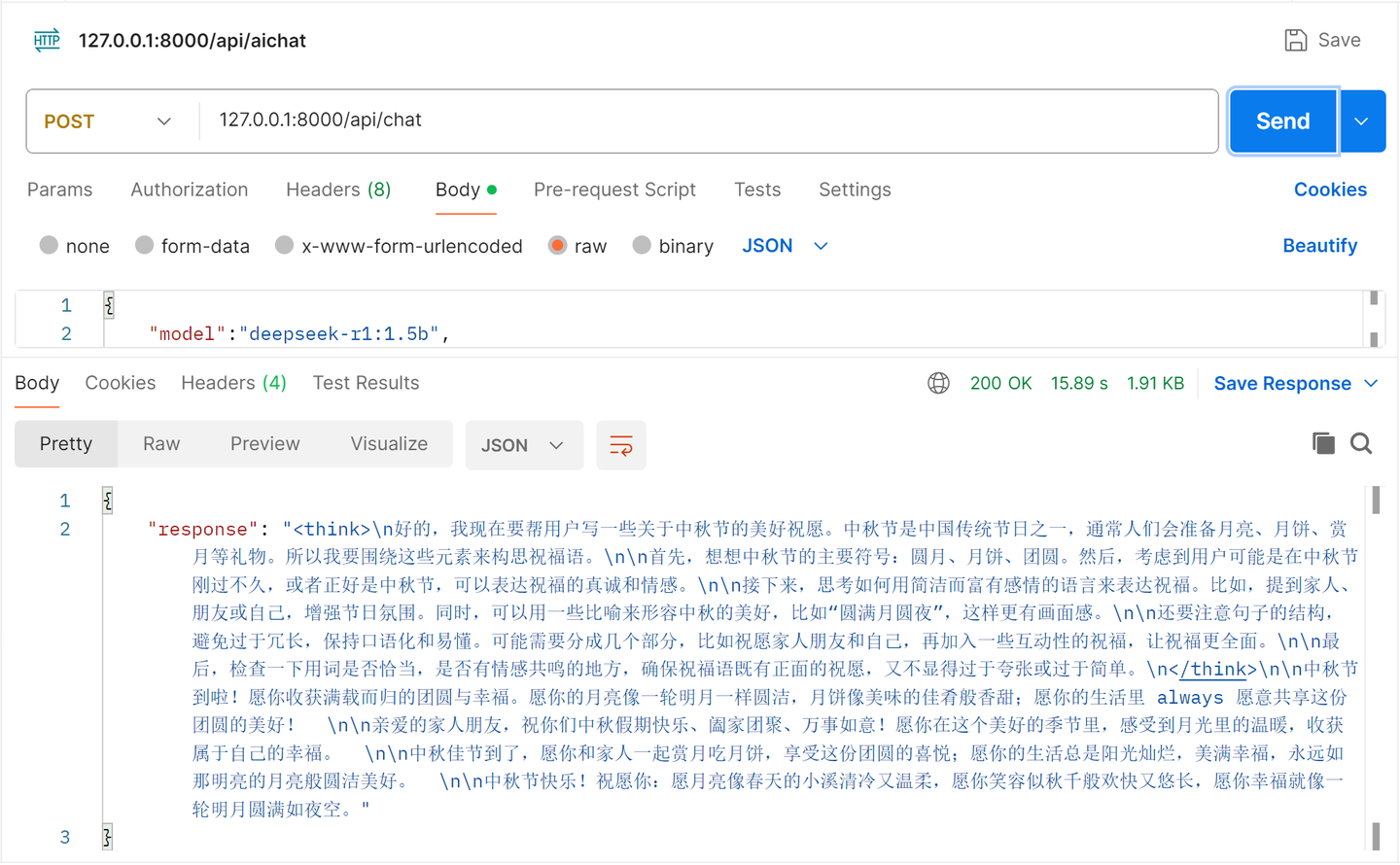 INFO: Uvicorn running on http://0.0.0.0:8000 (Press CTRL+C to quit) 可以使用接口测试工具Postman测试接口是否可以正常调用,输出的结果包含了思考部分和最终结果,可以实现推理到结果的过程: