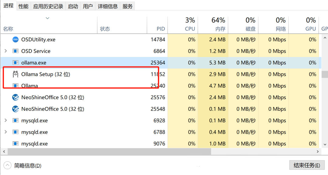 5.目录迁移前先查看进程中Ollama是否正正运行,如在运行中需先结束进程,避免文件拷贝失败;