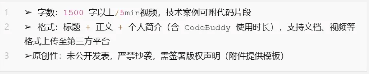 作者可在文中嵌入专属“代码”(#CodeBuddy 1024),官方评选(产品深度体验官)10名幸运开发者领CodeBuddy官方文化衫(均码)一件