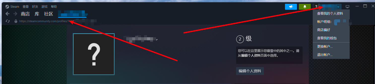 如图所示,登录 steam 后,点击右上角的名称,再点击 “查看我的个人资料”,再到左上角点击 URL,自动复制这个 URL
