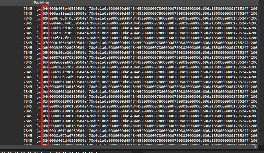 frame.len == 7845然后选中任意数据包,通过“CTRL+Shift+I”查看所有数据包的padding。