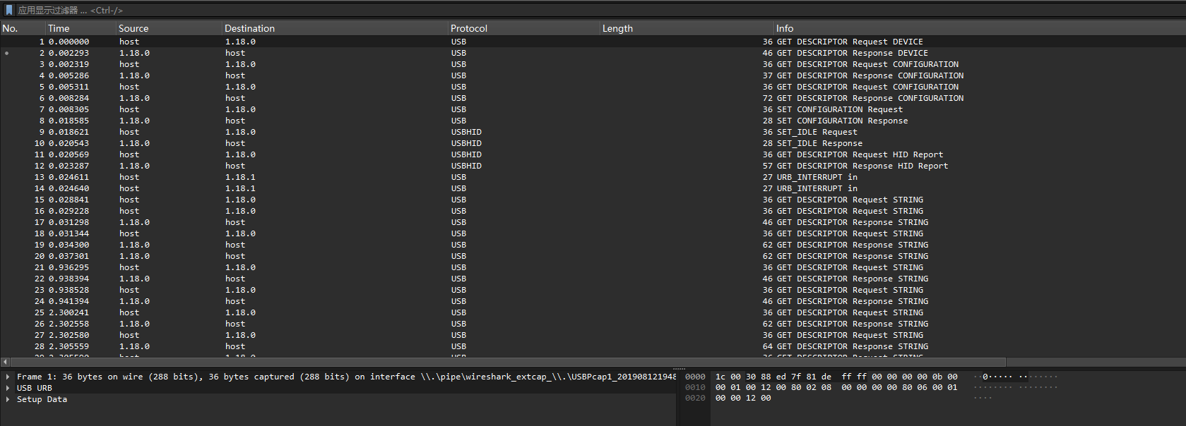 下载题目文件,zip中包含了一个名称为“usbtraffic”的pcapng日志文件。由于名称是usbtraffic,尝试用工具提取键盘敲击数据,结果没有提取出特别信息。打开wireshark开始看具体的数据包流量。