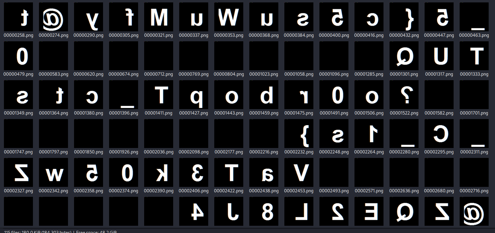 具体以上图为例,通过日志中padding的异位进行标注后,可以发现基本都是15个字符加上10个纯黑图。每25个图片可以看作是一组,同组中前15位代表十六进制位数对应的字符,比如第一组4对应字母t,8对应大写字母W,纯黑图也有十六进制,通过同组中的前15个对照可以得到纯黑图的具体字符表示。