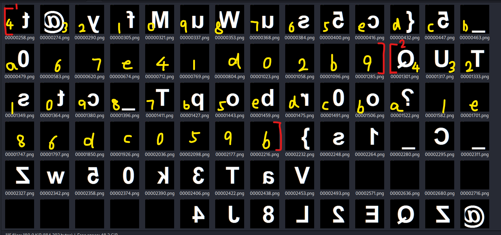 前面15个包的PNG内容不同,中间10个包除了前面这个不同的位之外PNG内容相同。数量上和前面foremost导出的图片相同,也就是15个不同的图片加上10个纯黑色的图片。我们把上面开头的数字和相应顺序的图片进行备注,备注后就可以推断出中间跟着的纯黑图片的具体对映内容了。