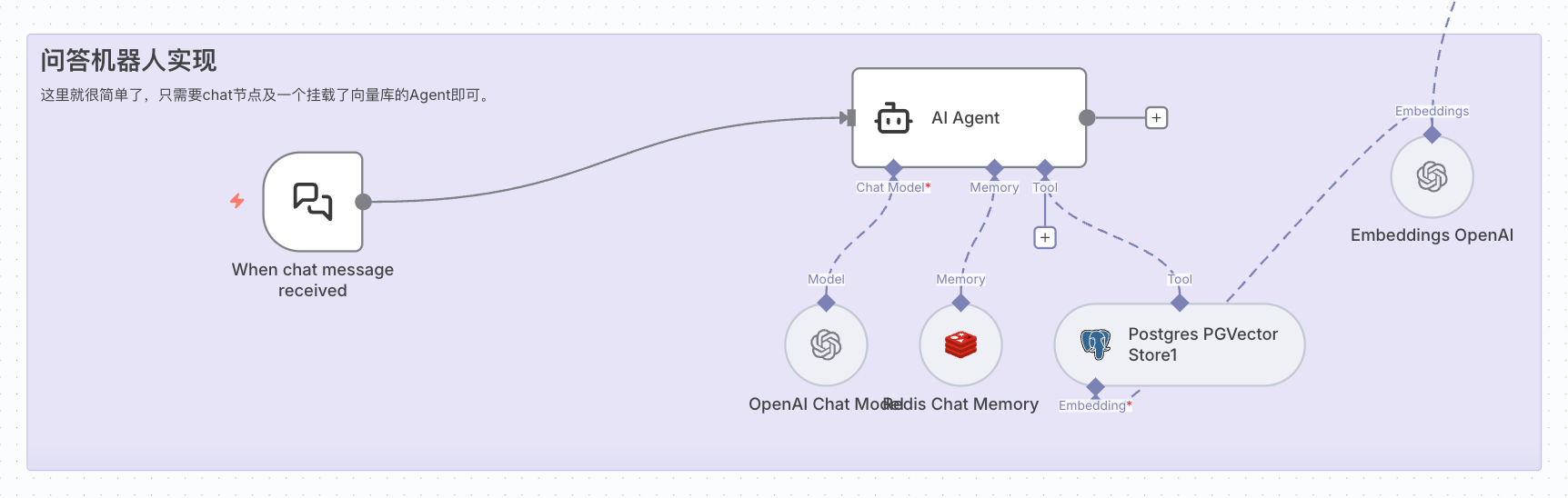 再回到具体实现,这里我使用了基于 Postgress 的 PGVector ,它是 PostgreSQL 的一个扩展,可以直接在关系数据库中存储和检索向量数据。相比专门的向量数据库,PGVector 的优势在于可以与现有的 PostgreSQL 数据库无缝集成,减少了系统的复杂度。配置过程也很简单,只需要在 n8n 的 Vector Store 节点中选择 PGVector,填入数据库连接信息即可。