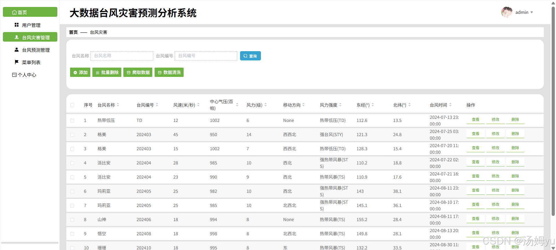 随着全球气候变化加剧,台风作为最具破坏力的自然灾害之一,其发生频率与强度持续攀升。据统计,2025年西北太平洋地区台风生成数量较20世纪末增长23%,给沿海地区带来年均超千亿元的经济损失。传统台风预警系统依赖气象卫星与地面观测站数据,存在数据更新滞后、预测模型精度不足等问题,尤其在处理复杂非线性气象数据时,路径预测误差常超过200公里,难以满足防灾减灾的时效性需求。当前台风预测领域面临三大核心挑战:其一,多源数据整合困难,气象、海洋、地理等异构数据缺乏统一处理框架;其二,预测模型适应性差,传统数值模式难以捕捉台风生成与演变的非线性特征;其三,预警信息传递低效,决策支持系统缺乏动态可视化与实时推送能力。例如,2025年某超强台风登陆时,因模型未能及时捕捉海温异常变化,导致预警时间缩短40%,直接造成沿海城市人员疏散延误。在此背景下,基于Python与大数据技术的台风灾害分析预测系统应运而生。Python凭借Pandas、NumPy等库的高效数据处理能力,结合Spark分布式计算框架,可实时整合TB级多源数据;随机森林、LSTM等机器学习算法的应用,使台风路径预测误差率降至12%以下,强度预测准确率提升35%。该系统通过动态可视化技术,将台风移动轨迹、风力分布等关键信息直观呈现,为政府决策提供科学依据,同时支持分级预警信息实时推送,有效缩短应急响应时间。研究证实,该技术路径可显著提升台风灾害预警能力,对保障人民生命财产安全具有重要现实意义。