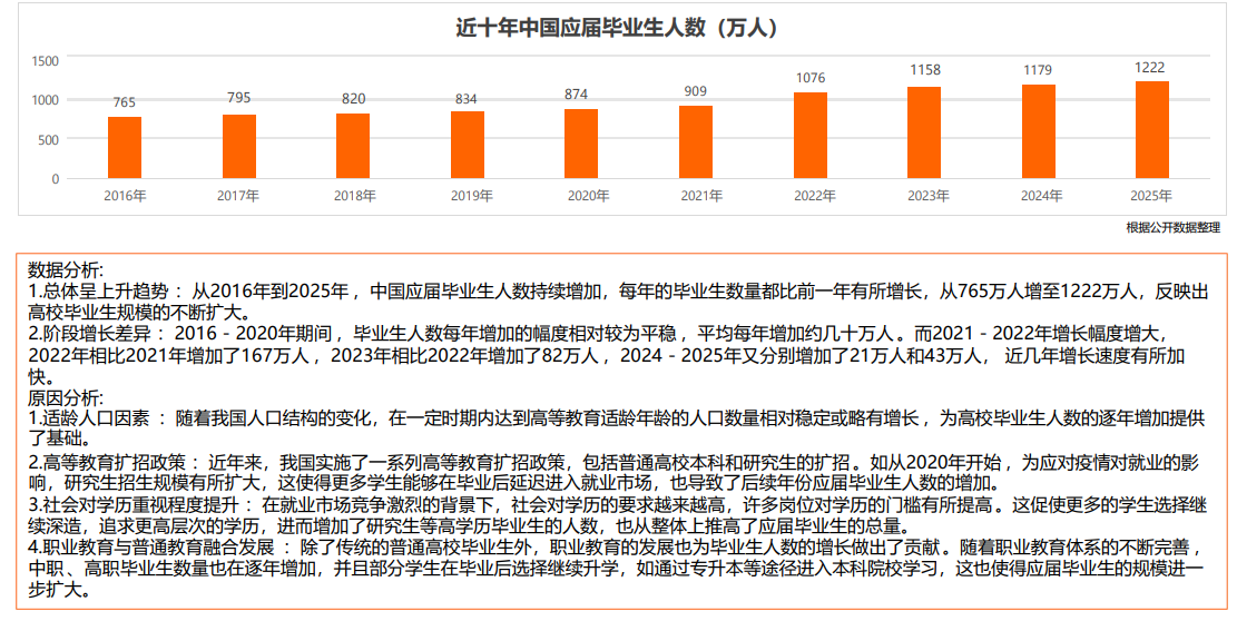 从图中可以看出,近10年,毕业人数翻了一倍,每年的增势较为平稳,当然这其中也有疫情时期研究生扩招等因素,所以说,每年的毕业生中,还有一部分是前几年的积累。