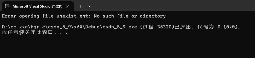 我们也可以了解⼀下 perror 函数,perror函数相当于⼀次将上述代码中的第9行完成了,直接将错误信息打印出来。perror函数打印完参数部分的字符串后,接着打印⼀个冒号和⼀个空格,再打印错误信息。