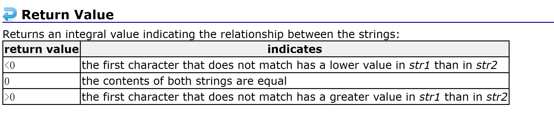 功能: 用来比较str1和str2指向的字符串,从两个字符的第一个字符开始比较,如果两个字符的ASCLL码值相等,就比较下一个字符,直到遇到不相等的两个字符,或者字符串结束。