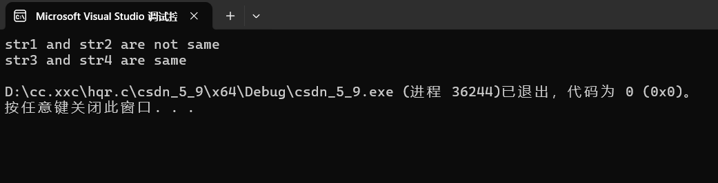 原因辨析:用相同的常量字符串去初始化不同的数组的时候就会开辟出不同的内存块,所以str1和str2不同;但是这里str3和str4指向的是同一个常量字符串,C/C++会把常量字符串存储到单独的一个内存区域,当几个指针指向同一个字符串时,他们实际会指向同一块内存,所以str3和str4相同。