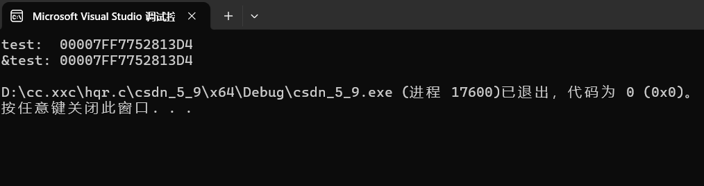 输出结果如上,可以看出函数名和&函数名的地址是一样的(这点和数组名不太一样) ,函数名就是函数的地址,我们可以用&函数名和直接用函数名这两种方式获得函数的地址。