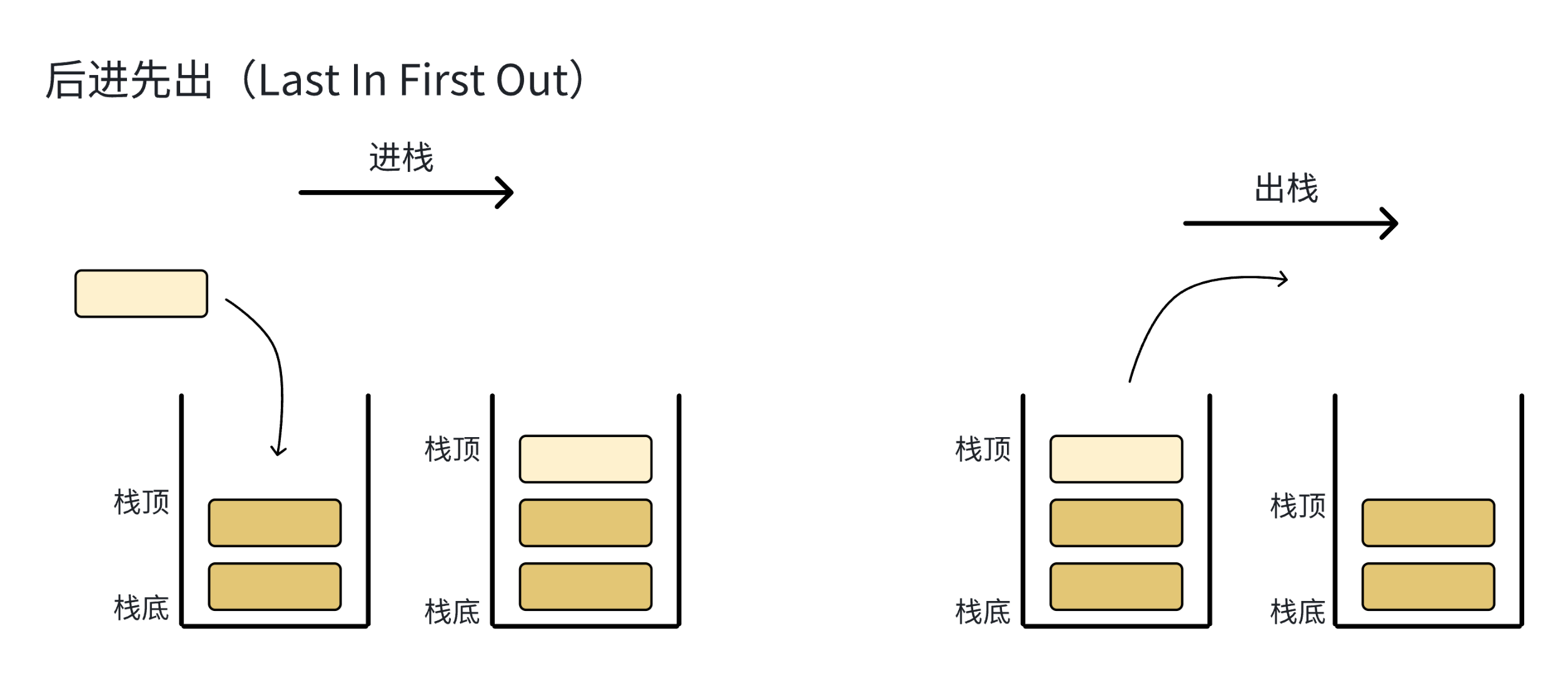 --栈:一种特殊的线性表,只允许在固定的一端进行插入和删除元素操作。进行数据插入和删除操作的一端称为栈顶,另一端称为栈底。栈中的数据元素遵守后进先出LIFO(Last In First Out)的原则。