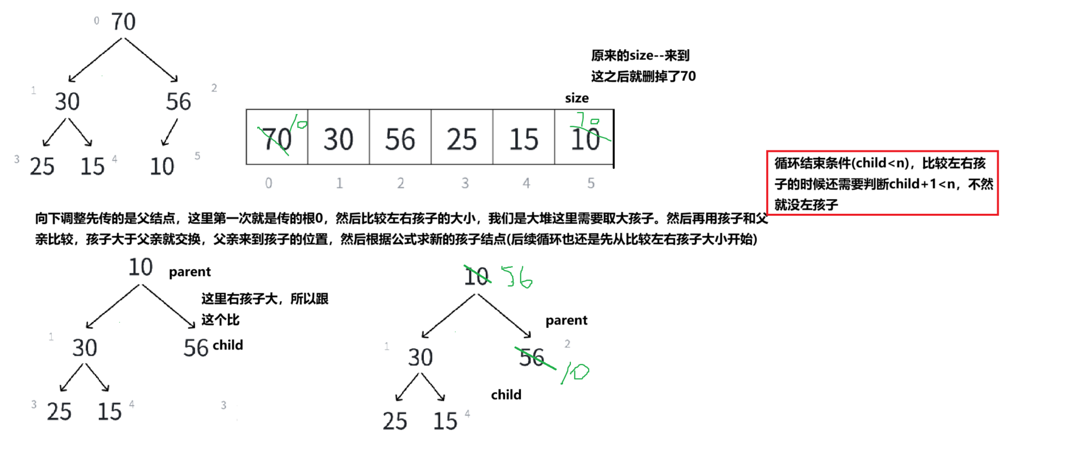 --我们实现堆的删除需要的是头部操作,如果跟顺序表一样去移动数据的话会改变掉堆的结构,所以我们可以先交换首尾数据,然后再把尾上的数据删掉。然后再通过向下调整算法将堆再次调整成一个大堆
