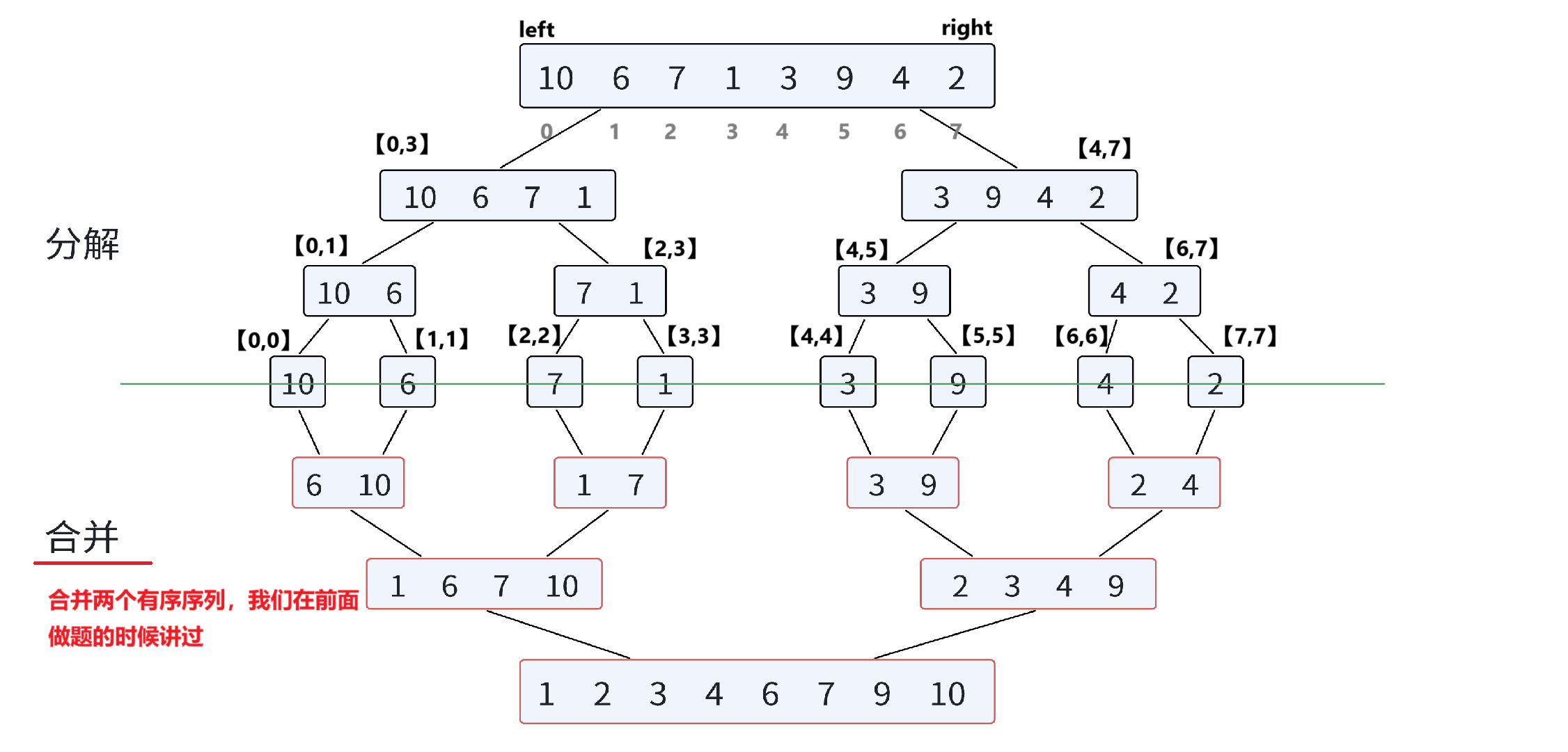 --我们着重讲一下分治的思想。合并操作需要注意的地方,大家看看后面代码的重点提示就行了