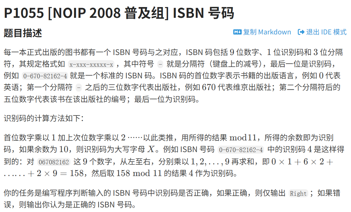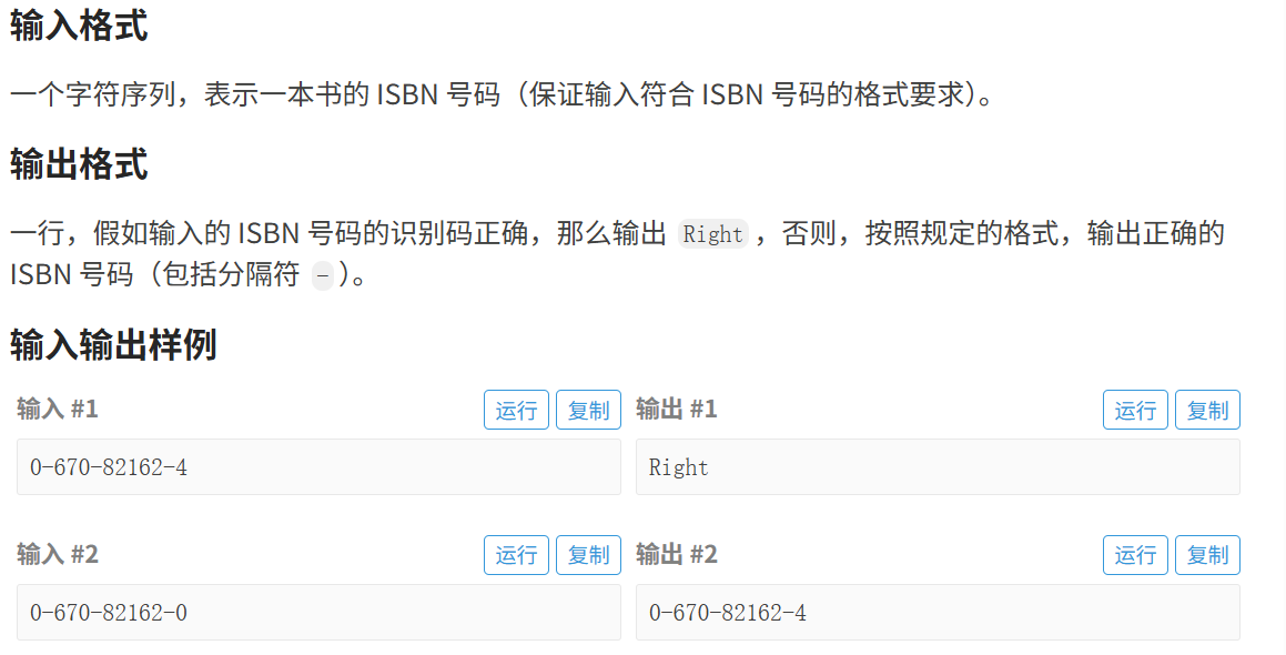 scanf 读取 ISBN 字符串,提取前 9 位数字转成数组 a ,按规则(首位乘 1 、次位乘 2 …… 第 9 位乘 9 求和取模 11 )计算识别码,与输入的识别码对比往期回顾: