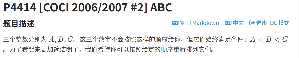 a、b、c 和三个字母 i、j、k,通过 min 和 max 函数确定最小、最大数存入 p[0]、p[2],再用嵌套 max 找中间可能值,通过条件判断确定中间数存入 p[1],最后按 i、j、k 对应的顺序(利用 ASCII 转换)输出 p 数组元素题目描述:
