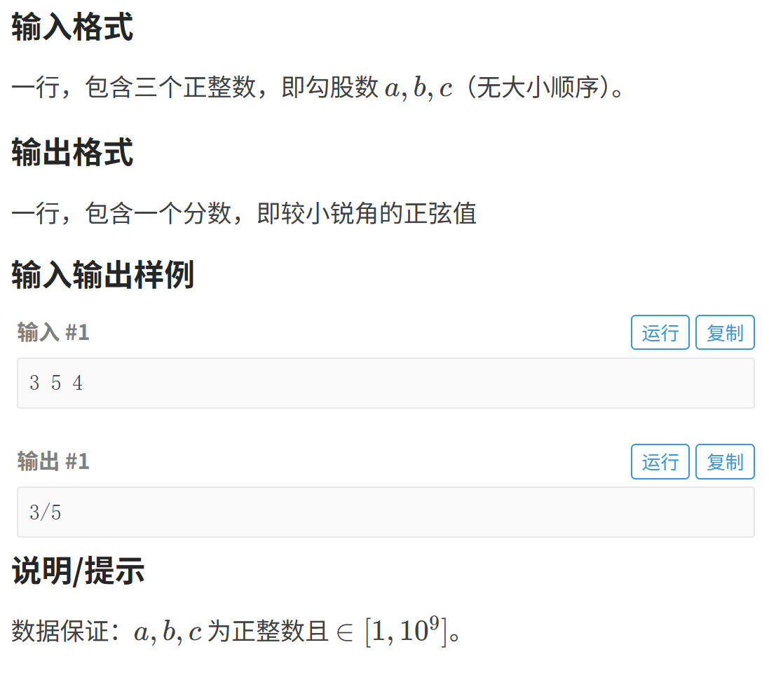 a[0])和斜边(a[2]),利用__gcd函数对最短边与斜边求最大公约数,将两者分别除以该公约数,以分数形式输出较小锐角的正弦值(即最短边 / 斜边约分后的结果 )。题目描述: