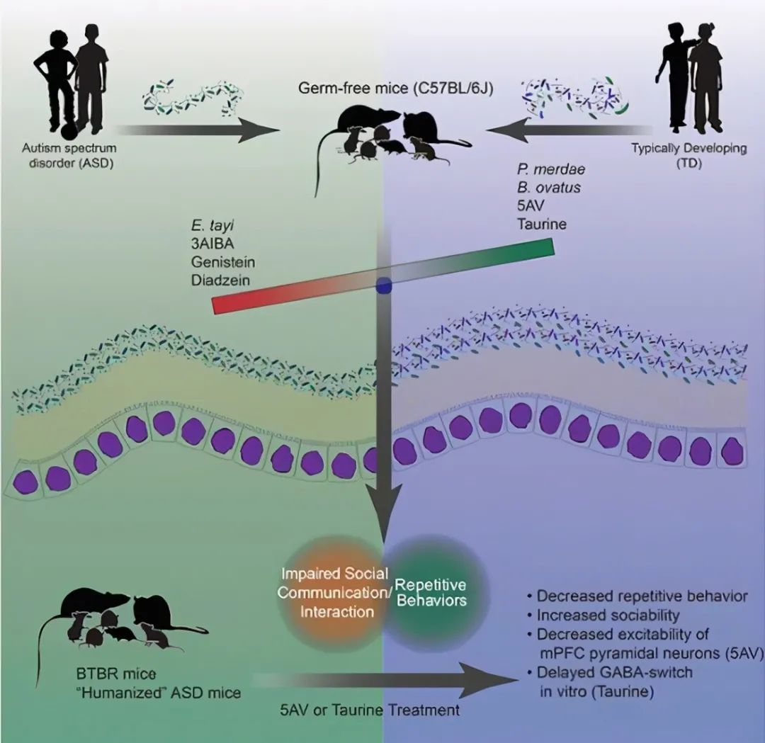 比如自闭症患者和小鼠中的微生物Eisenbergiela tayi 明显多于对照组,且这种菌群和重复性行为增加和社交减少呈现了负相关,换句话说,这类菌群是和自闭症有关的。