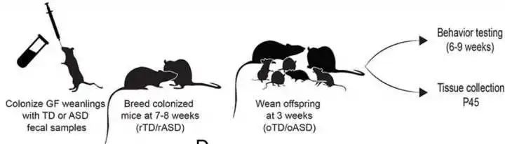 这样可以最大程度上避免小鼠本身肠道微生物的影响。同时选取了自闭症患者(Autism spectrum disorder,ASD)和正常个体(typically-developing,TD)两组群体,不过不是直接研究这些人,而是取了他们的粪便,因为粪便中有大量的微生物嘛。接下来,开展正式的研究,将两组患者的粪便分别移植到无菌小鼠体内,然后观察小鼠的行为。