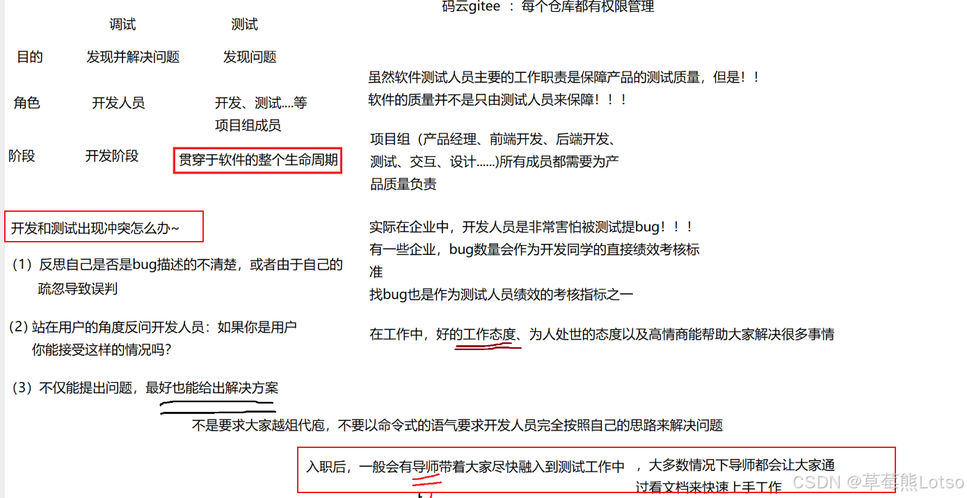 - 2)岗位性质:不管是测试还是测试开发都统称为测试人员,测试⼈员主要以保障项目测试质量为主,通过开发⼀些测试效率⼯具,比如我们要学的自动化就是效能⼯具等等来提高测试效率。而软件开发主要以业务编码为主。