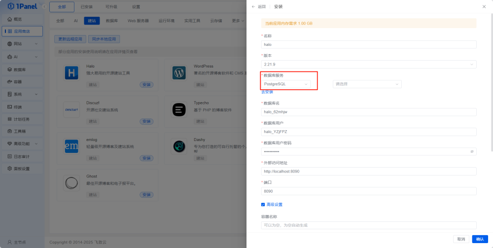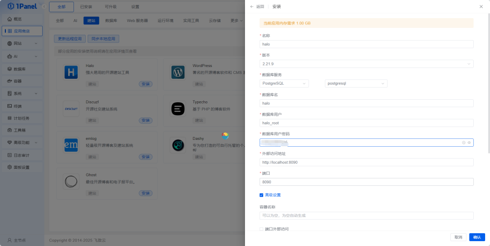 在1Panel的容器中,可以重复创建应用以搭建集群,因此,我们可以搭建多个Halo作为不同的博客需求。