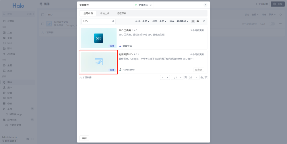 为了让博客真正被搜索引擎发现,我不仅配置了精准的站点标题、描述和关键词(如“云原生”“开发经验”“技术分享”),还安装了 Halo 的 SEO 插件以增强元数据控制。此外,我还探索了几个高阶集成: