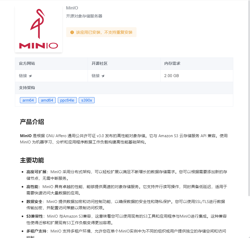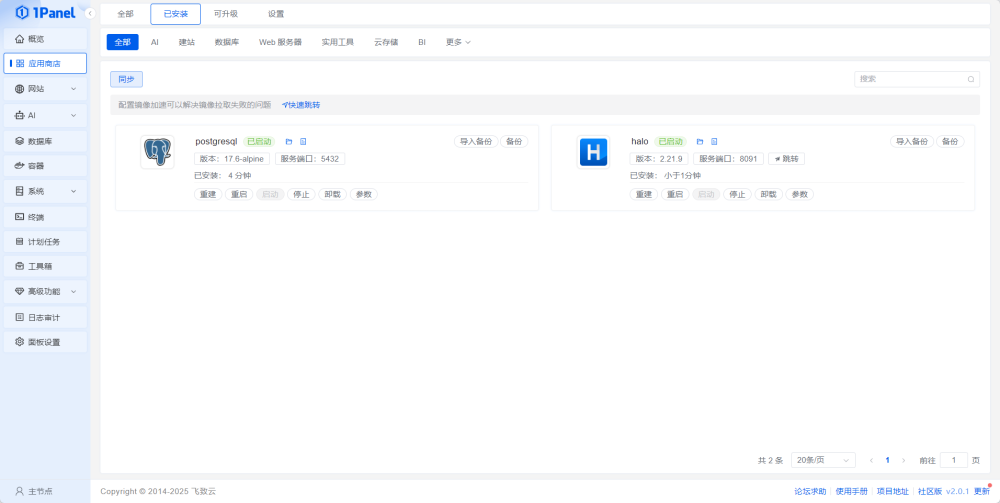 应用商店 | - 一键安装 Halo、WordPress、MySQL、Redis、Nginx、OpenResty、MaxKB、宝塔兼容版等- 支持版本管理、启停、卸载、配置修改 |