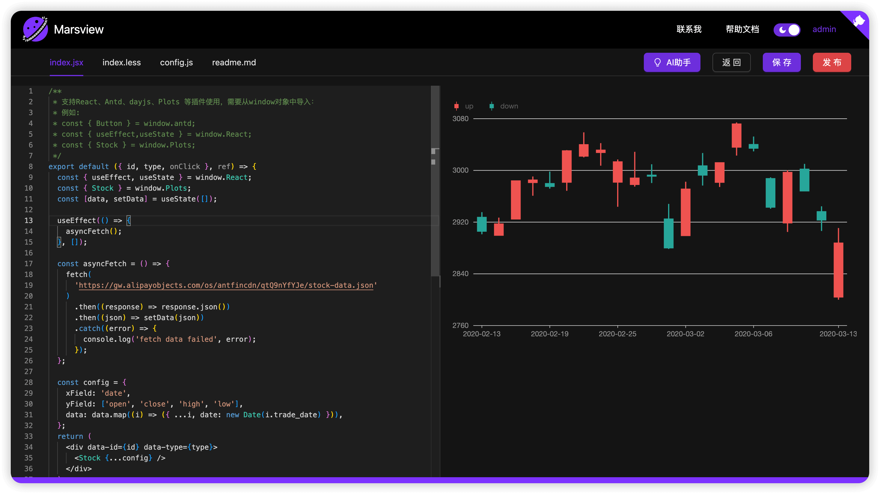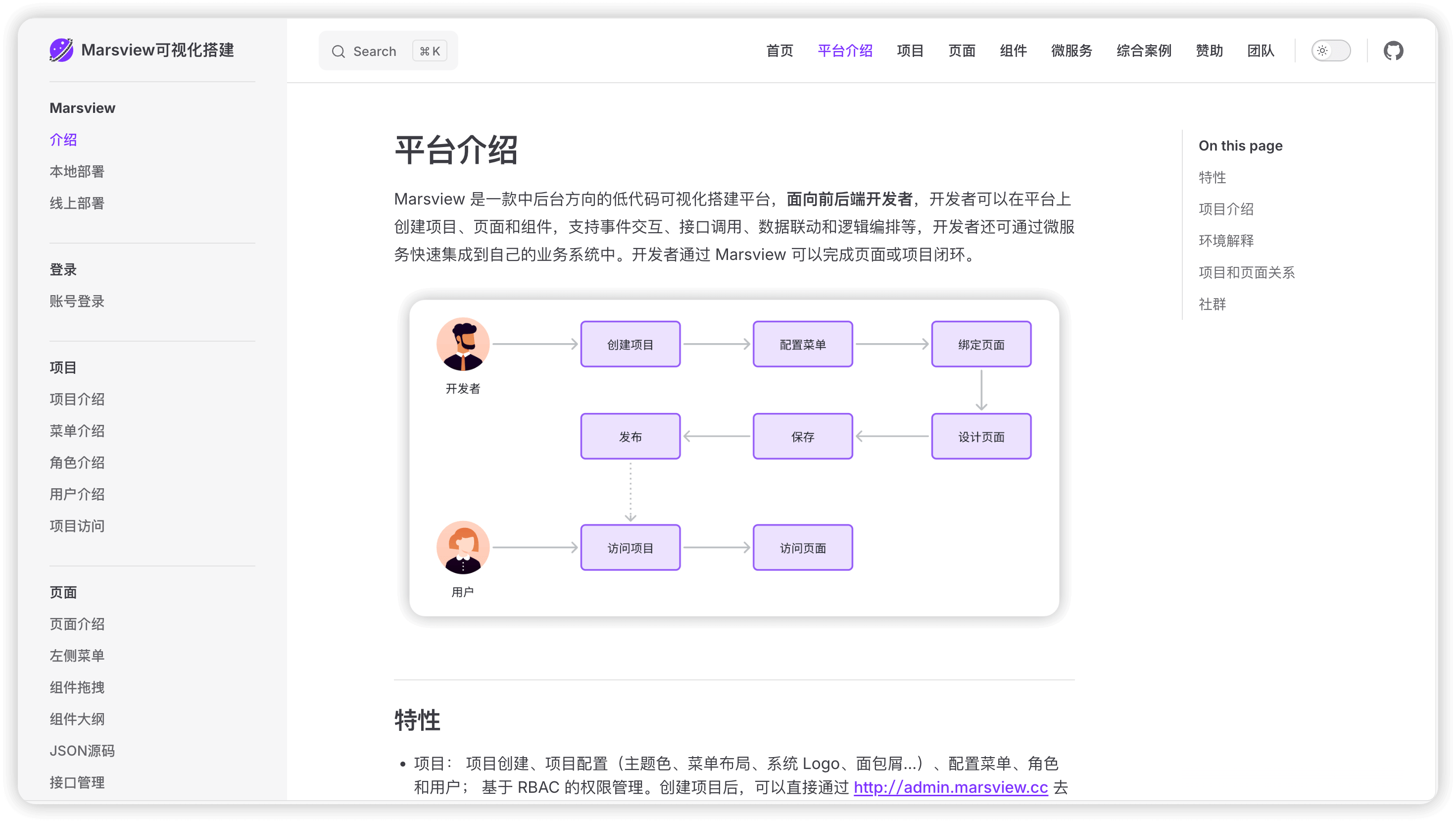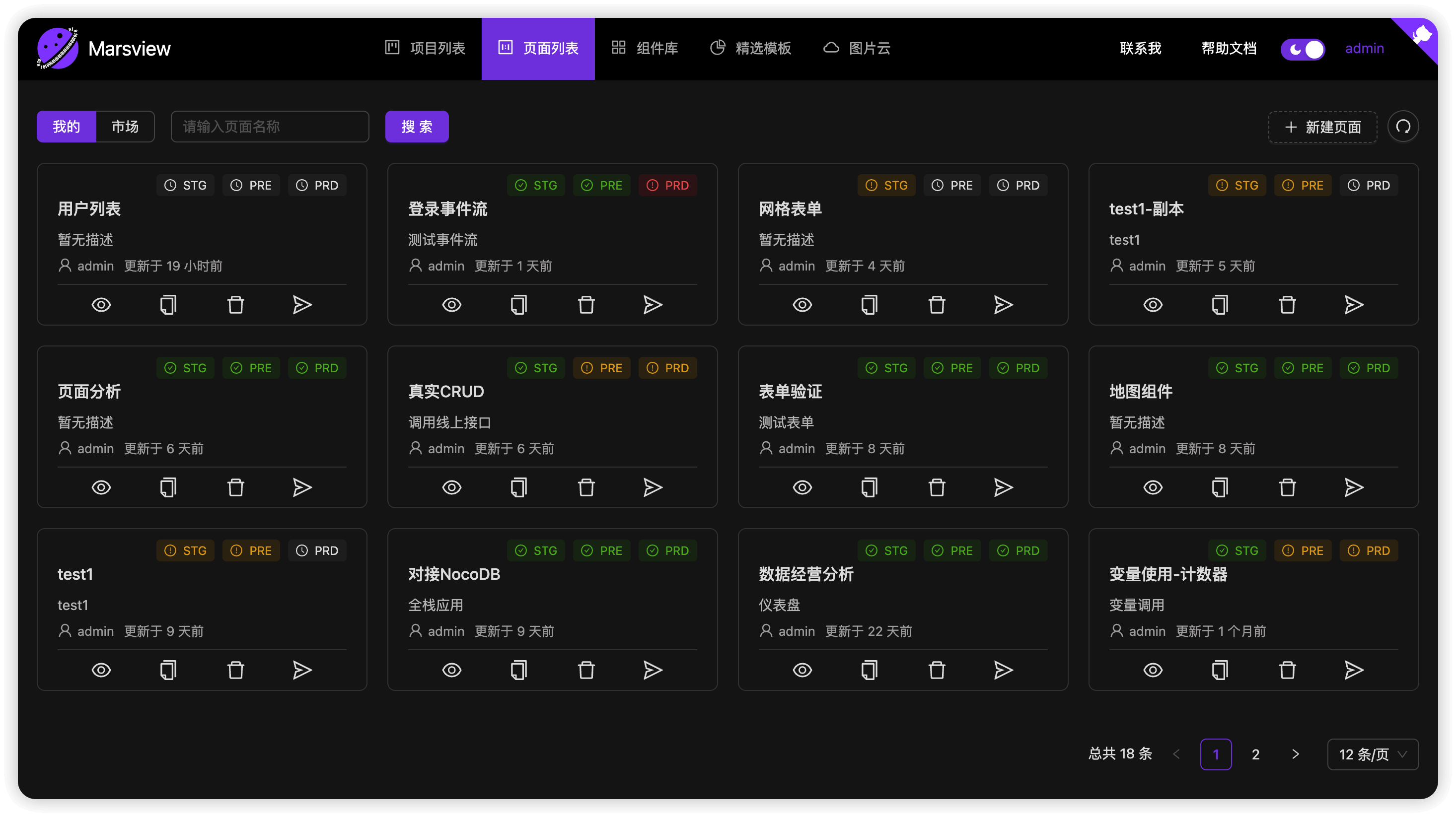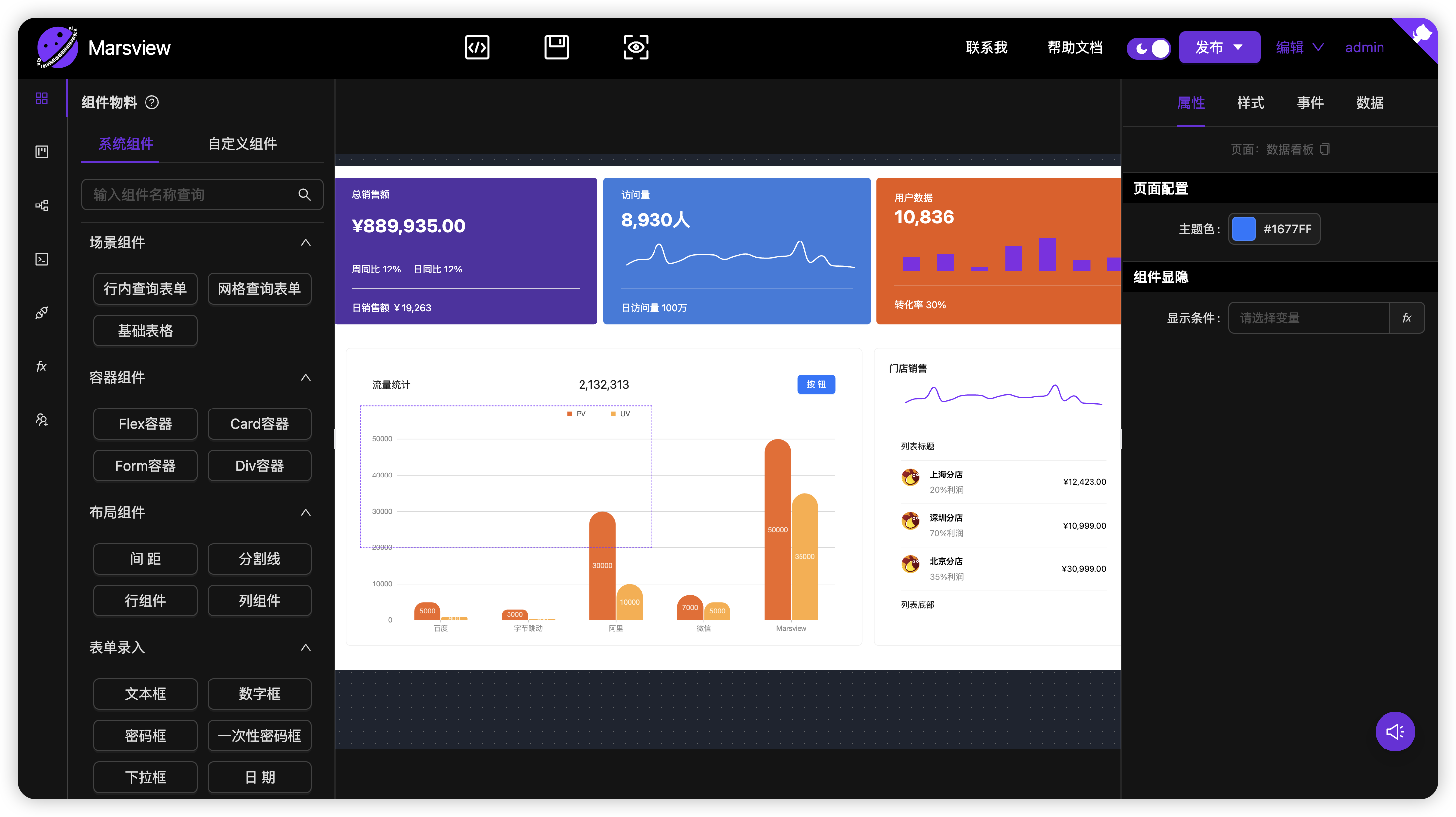 “Marsview 是一款中后台方向的低代码可视化搭建平台,开发者可以在平台上创建项目、页面和组件,支持事件交互、接口调用、数据联动和逻辑编排等” 简而言之:如果你需要快速构建后台管理系统、业务平台、仪表盘或中台系统,Marsview 提供了可视化拖拽、逻辑配置、接口管理、数据联动、发布回滚等能力,显著提升开发效率。 它侧重“中后台系统”(例如 CRM、ERP、OA、管理平台)而非面向大众 App 或 B2C 前端。