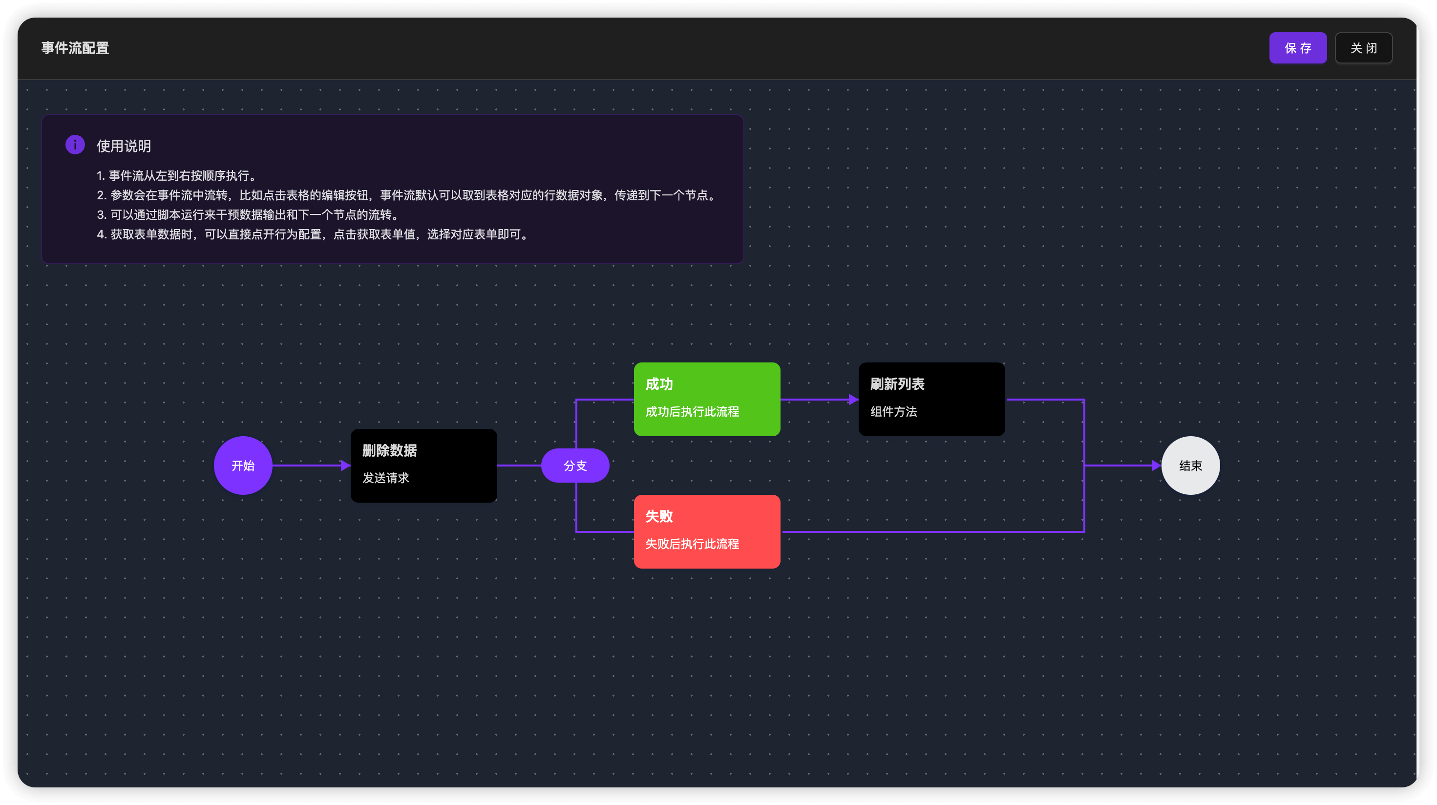 事件流配置 | 可视化配置 “组件联动、组件显隐、组件禁用、自定义逻辑、接口调用、路由跳转” 等流程。 |