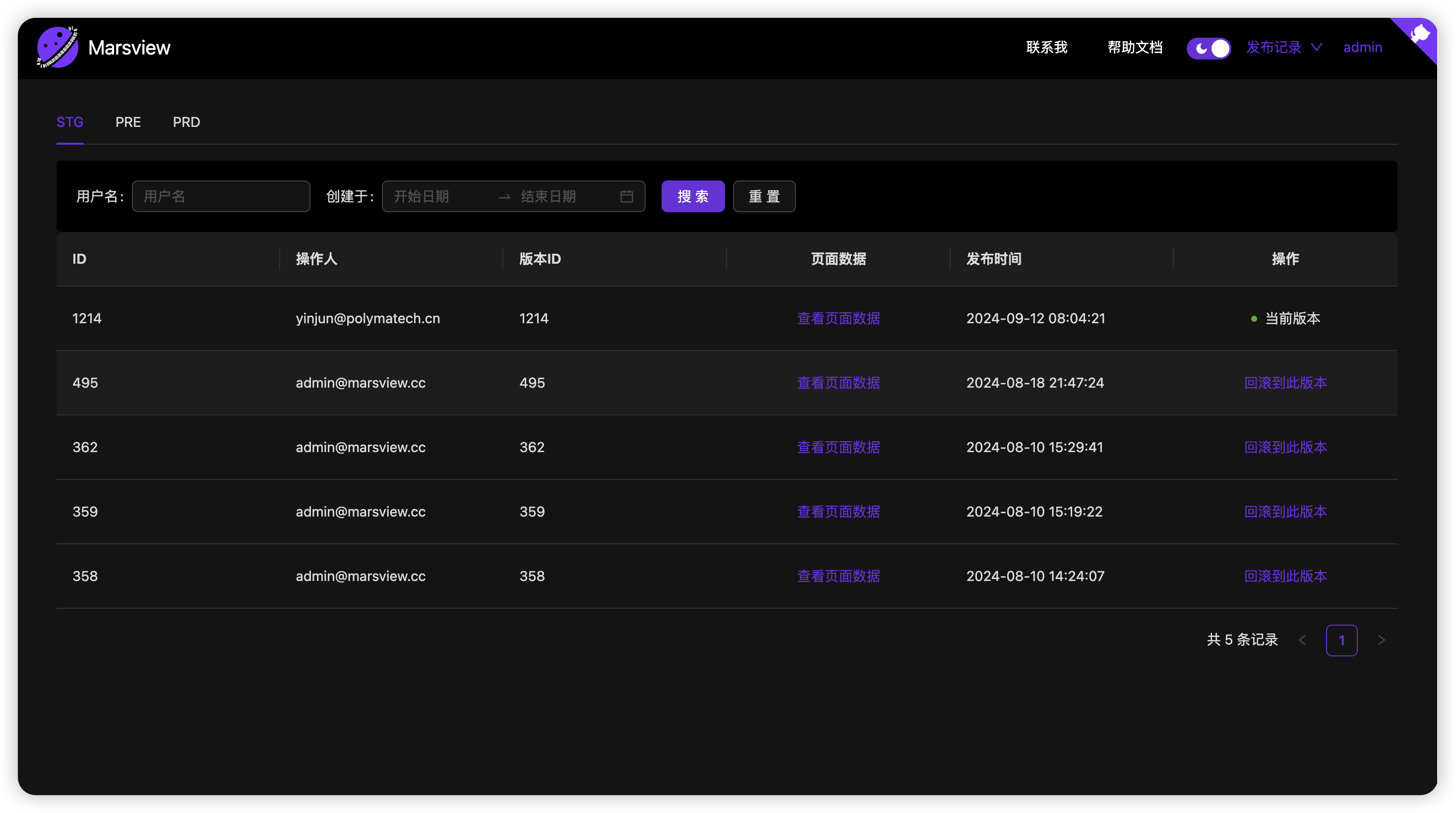 环境发布与回滚 | 支持 STG、PRE、PRD 三套环境,页面发布后可一键回滚。 |