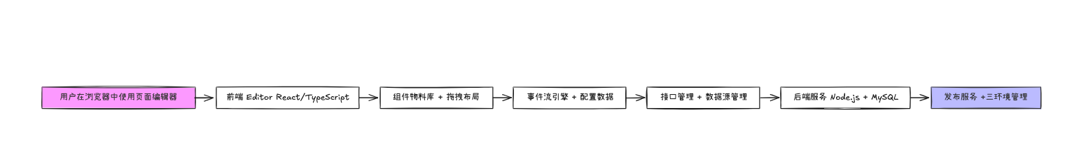 页面拖拽搭建 | 在编辑器内拖拽组件(按钮、表单、表格、富文本、图表、弹窗、iframe 等)搭建页面。 |
