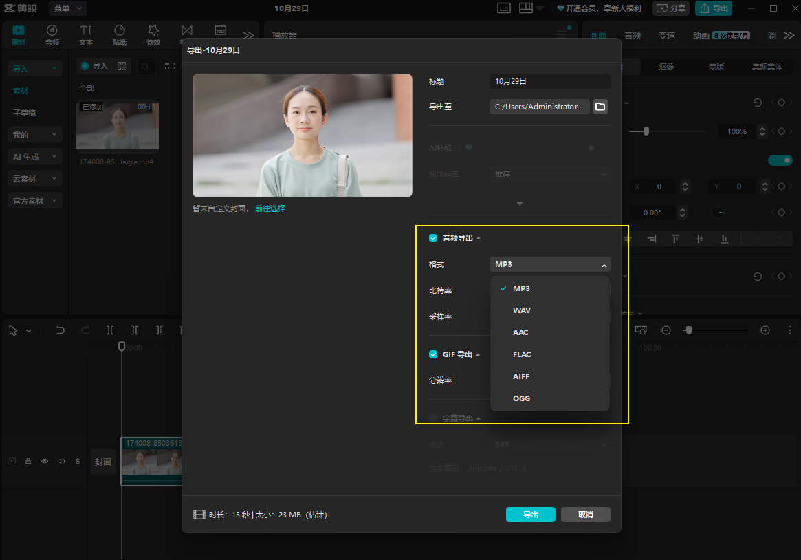 这是一款专业的视频剪辑工具,除了可以对视频进行剪辑、特效、滤镜、字幕等功能,在音频处理方面也毫不逊色,可以将视频中的音频给导出保存下来。只需在软件中将视频文件导入进来,在导出时选择音频导出,格式选择MP3格式,并且还可以设置音频的比特率、采样率、分辨率等,最后点击“导出”即可。