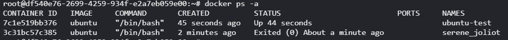 $ docker exec -it ubuntu-test /bin/bash进入后可以正常执行命令,想退出时输入exit,容器会继续在后台运行。