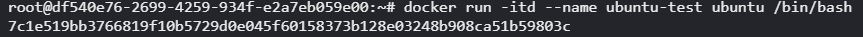 $ docker run -itd --name ubuntu-test ubuntu /bin/bash执行后会返回容器的ID,此时容器在后台运行,不会占用当前终端。