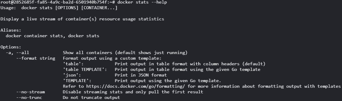 $ docker stats --help执行后会显示docker stats的参数、用法示例,遇到不懂的命令,这招总能帮上忙。