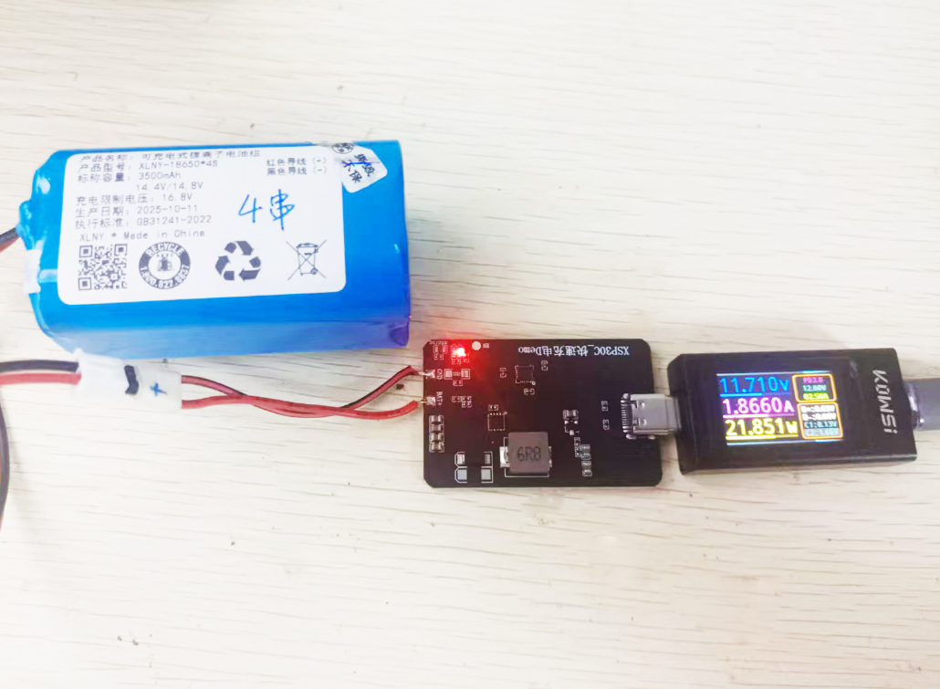 使用XSP30D电路充4串16.8V容量3200mAh锂电池,使用PD充电器充电功率最大45W,充电电流最大1.9A,充满电16.60V 充满电只需2小时30分左右