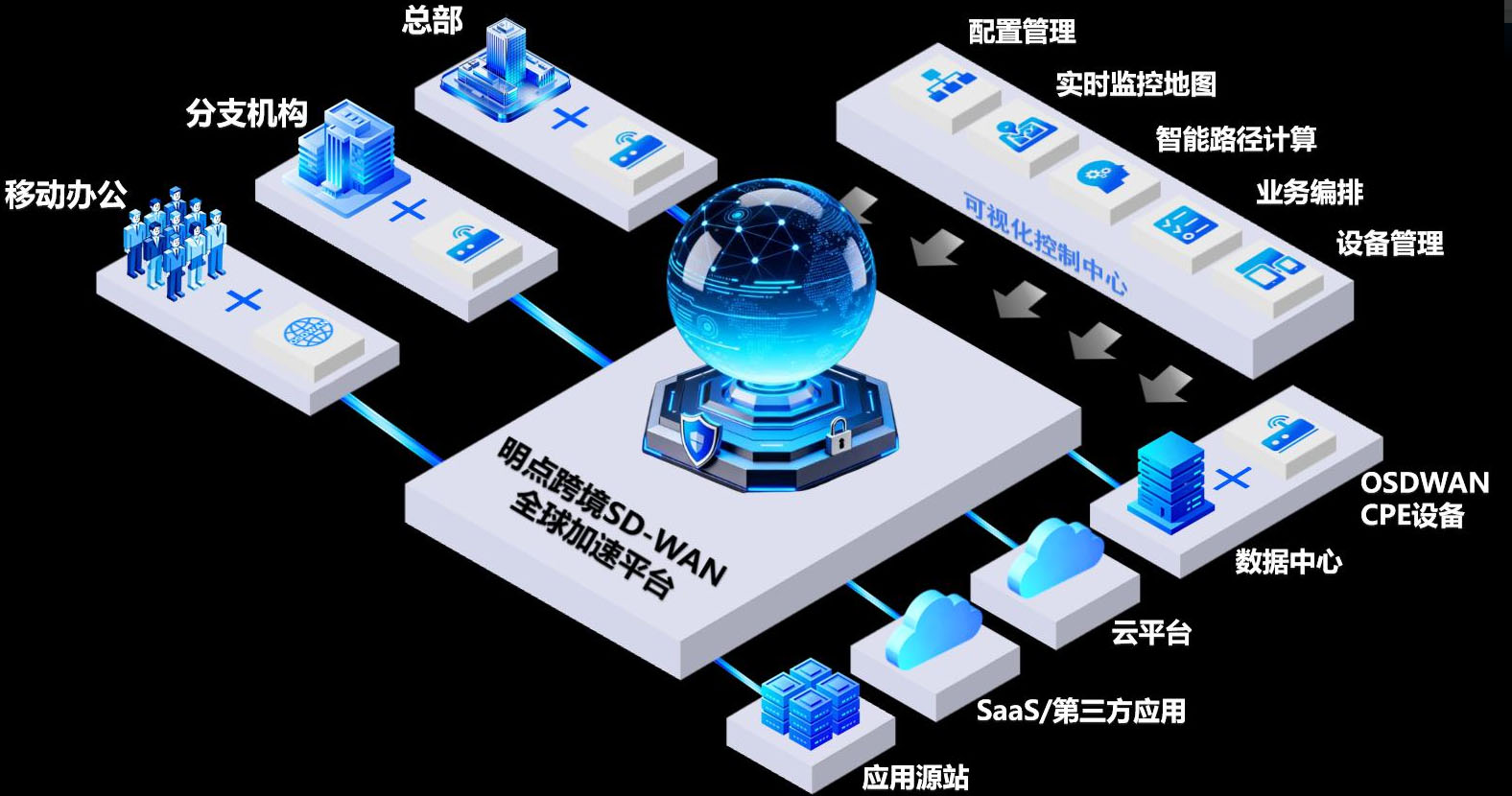 云应用和SaaS服务加速:企业大量使用Office 365、Salesforce、阿里云、AWS等云服务。SD-WAN可以将分支机构的流量智能地、安全地直接引向云端,而不是先回传到数据中心(避免“流量绕行”)。