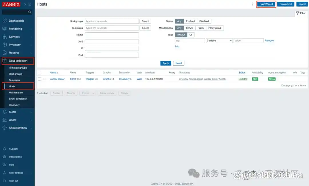 点击Data collection-Hosts,点击右上角的Host Wizard可进入主机向导,以添加Linux服务器为例子