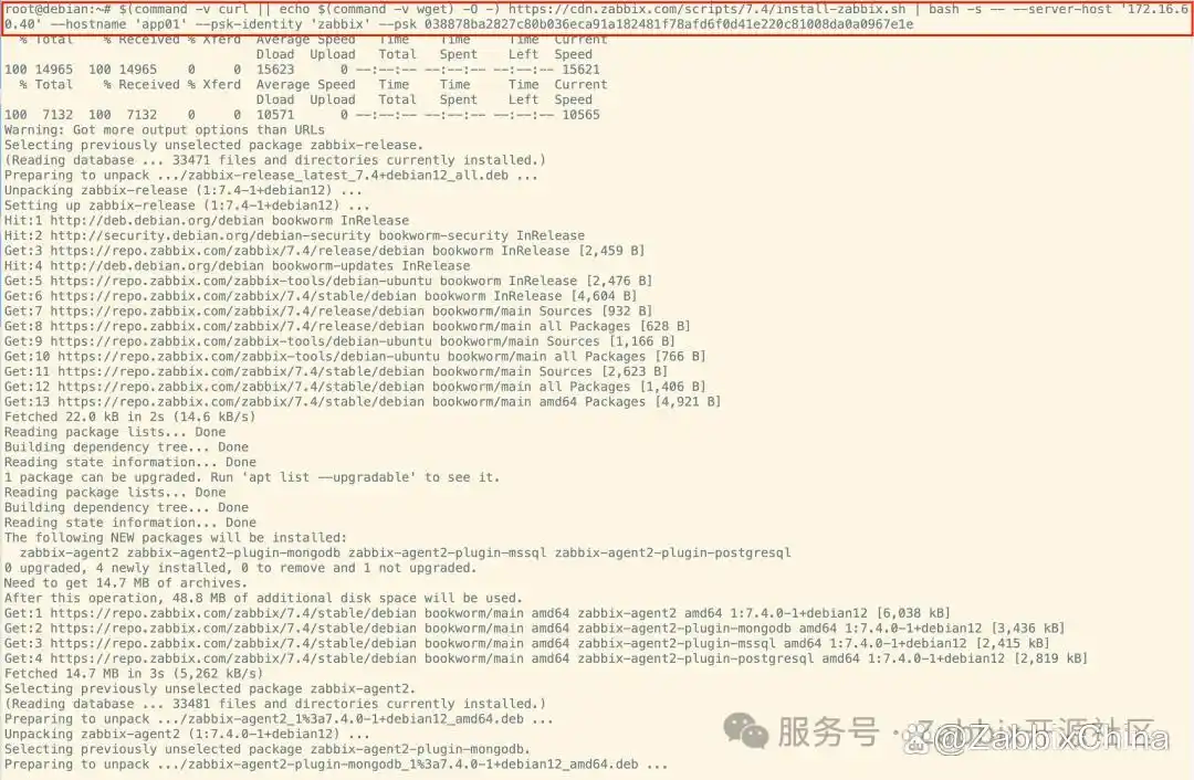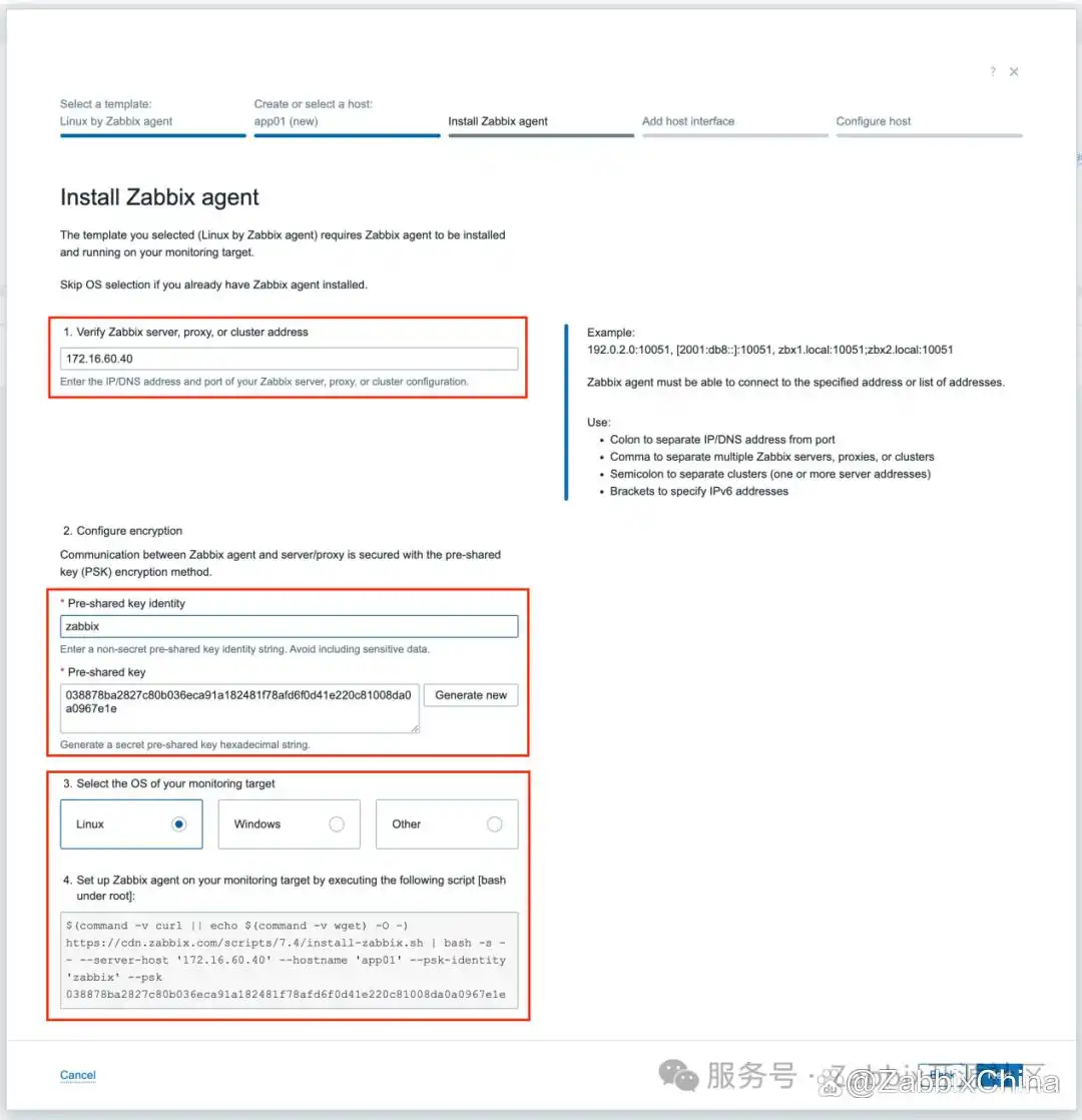 输入zabbix server(本例为172.16.60.40)或zabbix proxy的地址,并添加psk标识,psk会自动生成,操作系统选择linux,下方会生成zabbix agent的安装命令