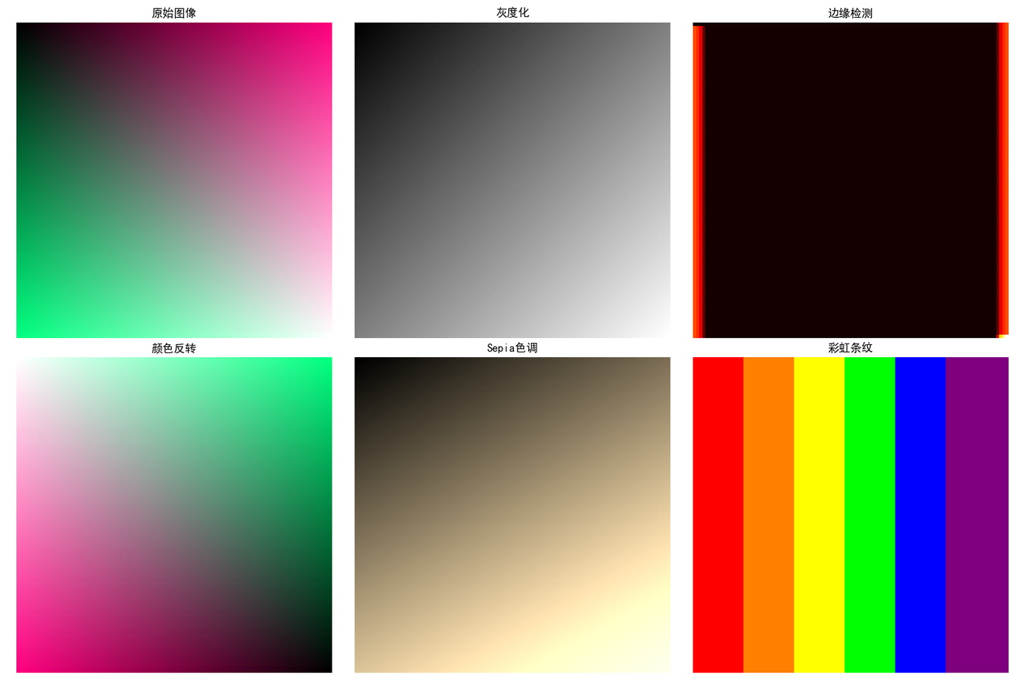 四个处理后的图像:灰度图、边缘检测图、颜色反转图、sepia色调图