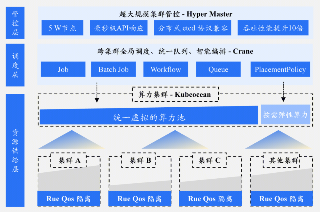 算力集群是 TKE 面向跨集群资源混部场景推出的首个全栈式产品化解决方案,旨在充分挖掘集群中的闲置算力,让资源成本迈向全局最优。方案默认集成了多集群资源管理、Crane 扩展调度 、混部隔离保障的 RUE 内核以及超大规模集群管控功能,全面降低用户在跨集群管理、资源调度和在离线混部上的维护复杂度。