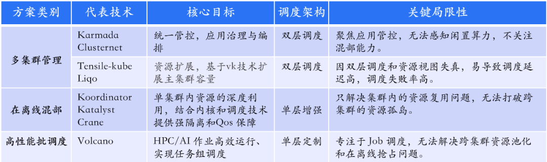 针对上述难题,业界公认的解决方式是 “在离线混部”技术(如 Koordinator,Caelus,Katalyst,Crane)。但混部并非“银弹”,当企业将混部能力从单个集群扩展到全局多个集群时,资源仍然被物理集群边界锁死。面对跨集群的资源调度问题,解决思路之一是利用 Virtual Kubelet 技术将下层集群的资源汇总并抽象为虚拟节点(如 Tensile-kube,Liqo),旨在扩展单集群的资源边界,但该方案同样存在不可忽视的局限性:
