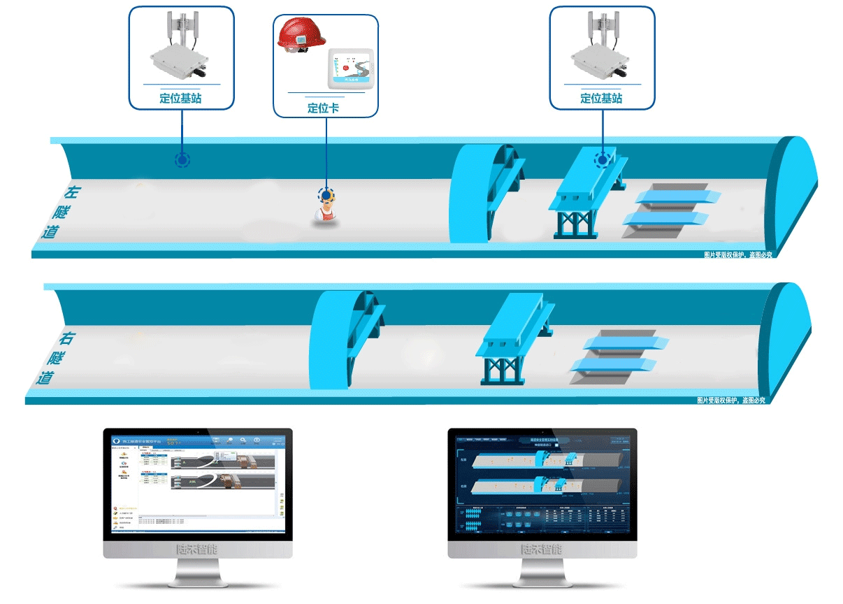 全线覆盖主要针对一些特长隧道,施工条件难度大,项目管理要求高的一些重点隧道工程,采用全线信号覆盖精准人员定位,每隔600-1000米安装一台定位基站,可做到隧道内的无线定位信号全覆盖,定位精度最大可达30CM。危险施工区域精准定位又称掌子面区域精准定位,即在防水板台车上安装1台高精度定位基站即可,基站将采集到进入该区域内的定位卡信号,通过无线网桥传输到后台管理系统中。