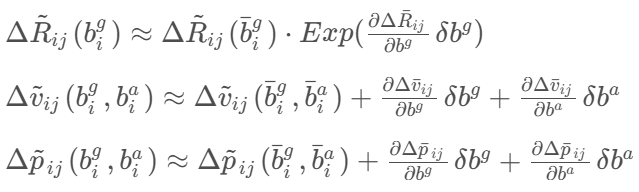 预积分量是在假设偏差不变的情况下计算的,但实际上,在优化过程中偏差是会被微调估计的,如果偏差变化了 δb,则不需要重新积分,而是使用一阶线性近似来更新预积分量,这是预积分理论高效的关键: